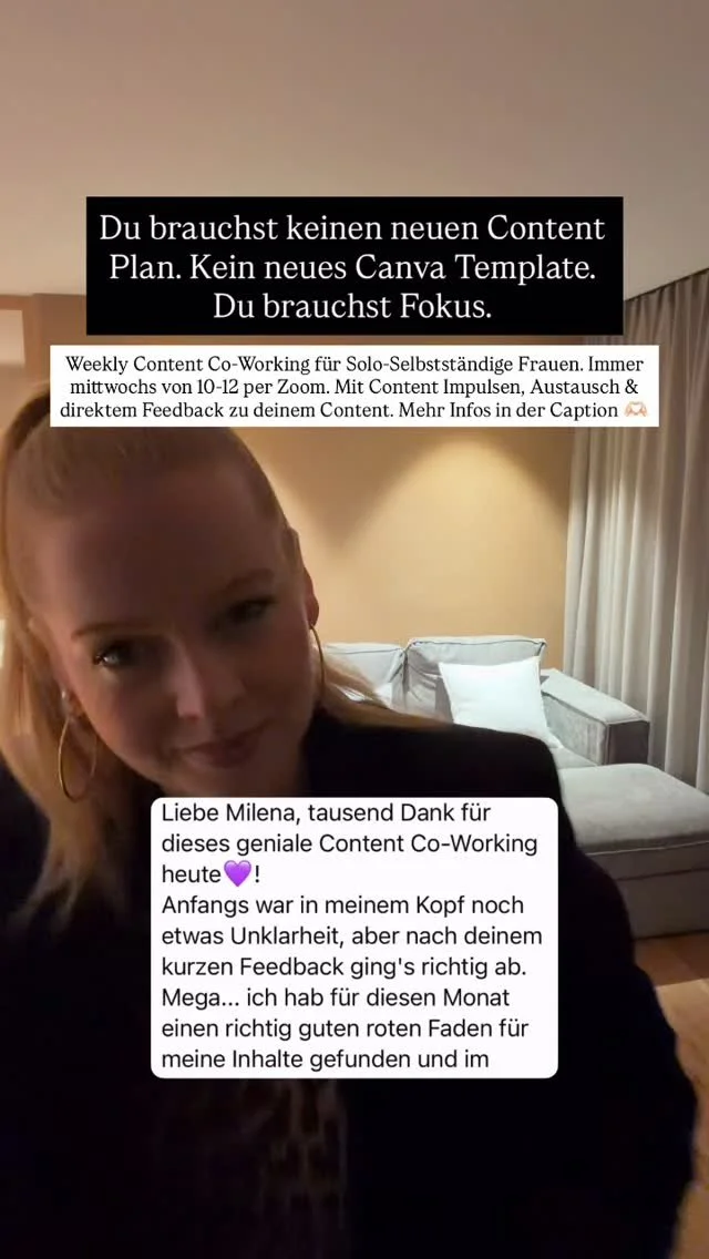 Wir treffen uns einmal pro Woche online und arbeiten nebeneinander an unserem Content. Ich halte den Rahmen, gebe inhaltliche Impulse und begleite den Prozess. Du kannst Fragen stellen, Gedanken teilen, festhängen, weitergehen. Genau so, wie es gerade ist.